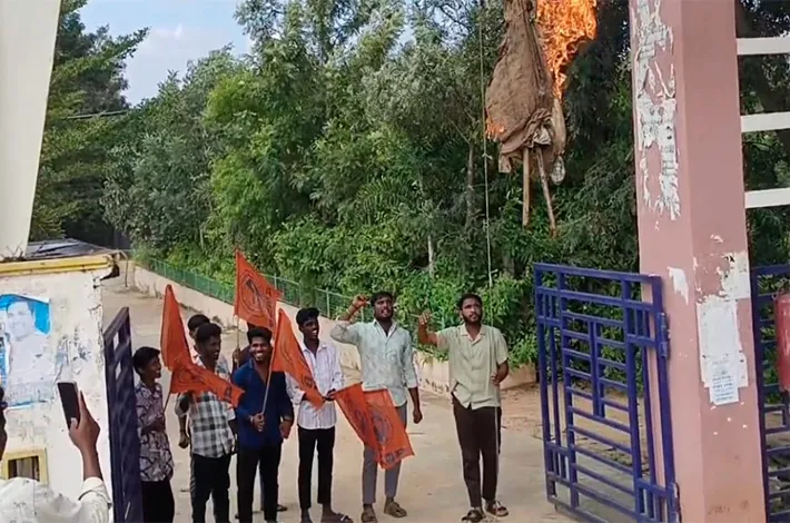 జడ్చర్ల అక్టోబర్ 30 (విజయ క్రాంతి):అఖిల భారతీయ విద్యార్థి పరిషత్ జడ్చర్ల శాఖ ఆధ్వర్యంలో డా బీఆర్ఆర్ డిగ్రీ కళాశాలలో విద్యార్థులకు చెల్లించాల్సిన స్కాలర్షిప్, ఫీజు రీయంబర్స్ మెంట్ బకాయిలను వెంటనే విడుదల చేయాలని రాష్ట్ర ప్రభుత్వ దిష్టి బొమ్మను జడ్చర్ల శాఖ ఆధ్వర్యంలో ప్రభుత్వ డిగ్రీ కళాశాల స్వాగత ఆర్చి కి వేలాడదీసి దహనం చేశారు. నగర కార్యదర్శి యశ్వంత్ మాట్లాడుతూ రాష్ట్రంలో కాంగ్రెస్ ప్రభుత్వం వచ్చి రెండు సంవత్సరాలు అవుతున్న నేటికి కూడా ఒక్క రూపాయి కూడా విద్యార్థులకు చెల్లించాల్సిన స్కాలర్షిప్ ఫీజు రియంబర్స్మెంట్ బకాయిలు చెల్లించకుండా కాలయాపన చేస్తున్నారని దీంతో అనేక ప్రైవేట్ కళాశాలలు మూతపడి విద్యార్థుల జీవితాలు రోడ్డున పడుతున్నాయన్నారు.