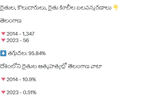 హైదరాబాద్: మాజీ ముఖ్యమంత్రి కె. చంద్రశేఖర్ రావు(Kalvakuntla Chandrashekar Rao) పాలన దశాబ్దం తెలంగాణలో రైతులకు(Farmers) స్వర్ణయుగంగా నిలిచిందని, బీఆర్ఎస్ ప్రభుత్వ సంక్షేమ పథకాల కారణంగా 2014-2023 మధ్య రైతుల ఆత్మహత్యలు 95 శాతం తగ్గాయని బీఆర్ఎస్ వర్కింగ్ ప్రెసిడెంట్ కేటీ రామారావు(BRS Working President KT Rama Rao) అన్నారు. ఎన్సీఆర్బీ (National Crime Records Bureau) డేటాను ఉటంకిస్తూ, రైతు బంధు, ప్రభుత్వ పంట సేకరణ, రుణమాఫీలు, కాళేశ్వరం(Kaleshwaram) వంటి నీటిపారుదల ప్రాజెక్టులు వ్యవసాయ కుటుంబాలకు స్థిరత్వాన్ని తీసుకురావడానికి దోహదపడ్డాయని కేటీఆర్ ప్రశంసించారు. అయితే, కేవలం రెండు సంవత్సరాలలో కొత్త కాంగ్రెస్ పాలనలో(Congress rule) పరిస్థితి మరింత దిగజారిందని ఆరోపించారు. కానీ మళ్ళీ కాంగ్రెస్ రాగానే పరిస్థితి తారుమారైందని ఆరోపించిన కేటీఆర్ రెండేళ్లలోనే సుమారు 700కు పైగా అన్నదాతల ఆత్మహత్యలు నమోదయ్యాయని విమర్శించారు. మళ్ళీ కేసీఆర్ రావాలి.. రైతులు చల్లగా నూరేళ్లు వర్ధిల్లాలని కేటీఆర్ ఆకాంక్షించారు. రైతు ఆత్మహత్యల తెలంగాణను కేసీఆర్ పాలన దశాబ్దం పాటు అన్నపూర్ణగా మార్చిందని హరీష్ రావు అన్నారు.