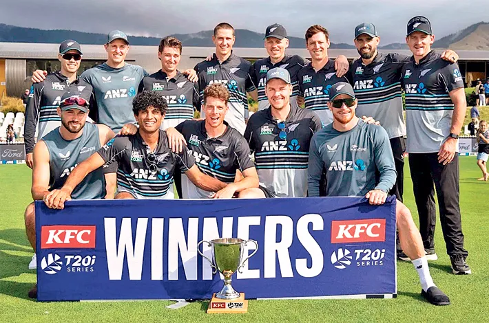 నెల్సన్: స్వదేశంలో శ్రీలంకతో జరిగిన టీ20 సిరీస్ను న్యూజిలాండ్ 2 సొంతం చేసుకుంది. గురువారం జరిగిన మూడో టీ20లో శ్రీలంక ఏడు పరుగుల తేడాతో విజయాన్ని అందుకుంది. తొలుత బ్యాటింగ్ చేసిన శ్రీలంక 20 ఓవర్లలో 5 వికెట్ల నష్టానికి 218 పరుగులు చేసింది. కుశాల్ పెరీరా (46 బంతుల్లో 101) సెంచరీతో కదం తొక్కాడు. అసలంక (46) రాణించాడు. కివీస్ బౌలర్లలో మాట్ హెన్రీ, జాకబ్ డఫీ, ఫౌల్క్స్, సాంట్నర్ తలా ఒక వికెట్ తీశారు. అనంతరం బ్యాటింగ్ చేసిన న్యూజిలాండ్ 20 ఓవర్లలో 7 వికెట్ల నష్టానికి 211 పరుగులు చేసింది. రచిన్ రవీంద్ర (69), టిమ్ రాబిన్సన్ (37) రాణించారు. లంక బౌలర్లలో అసలంక 3 వికెట్లు తీయగా.. హసరంగ 2 వికెట్లు పడగొట్టాడు.