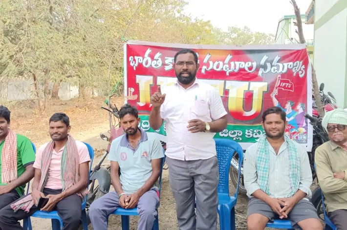 అదేవిధంగా ప్రజలకు 6 గ్యారెంటీలను వాగ్దానం చేసి 7వ వాగ్దానం ప్రజాస్వామ్యం పరిరక్షణ కాపాడుతానని అన్నారని కానీ నేడు ప్రజాస్వామ్యం పరిహాసం చేయబడుతుందని ఆయన అన్నారు. అధికారంలో ఉన్నప్పుడు అధికారంలో లేనప్పుడు ఒక మాట అధికార లో ఉన్నప్పుడు ఒక మాట మాట్లాడడం పాలక పార్టీలకు అలవాటైందని అట్టి విషయాన్ని కార్మిక వర్గం అర్థం చేసుకొని ఉద్యమించాలని పిలుపునిచ్చారు. అధికారం కోసం అనేక తప్పుడు వాగ్దానాలు ఇచ్చి గెలిచిన తర్వాత వాటిని విస్మరించడం పాలక పార్టీలకు అలవాటైందని దీనిని కార్మిక వర్గం అర్థం చేసుకోవాలని కోరారు. కాంగ్రెస్ పార్టీ ఇచ్చిన కార్మిక సమస్యల పరిష్కారం కొరకు ఇచ్చిన హామీని అమలు చేయాలని కోరుతూ ఫిబ్రవరి 20న సంఘటిత. అసంఘటిత రంగ కార్మికులు అధిక సంఖ్యలో పాల్గొని జయప్రదం చేయాలని పిలుపునిచ్చారు. ఈ కార్యక్రమంలో ఐ ఎఫ్ టి యు జిల్లా నాయకులు బోడా మంచ జి ప్రసాద్. బి మహేష్. భరోత్ బన్సీ బి బాల. బి.బిచ్చు.బి . రవి, శ్రీరాములు, చిన్న, గ్రామపంచాయతీ వర్కర్స్ యూనియన్ నాయకులు కత్తుల ఎర్రయ్య, మూడు బిచ్చు, సురేష్ తార్యా, లింగ తదితరులు పాల్గొన్నారు.