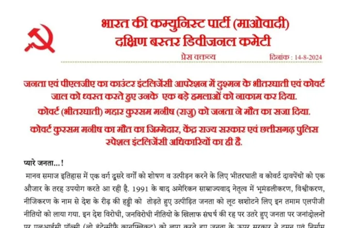 జగిత్యాల: జనతా, పిఎల్ జిఏ నిర్వహించిన కౌంటర్ ఇంటెలిజెన్స్ ఆపరేషన్లో వారి రహస్య, ఆకస్మిక ఉచ్చులను ధ్వంసం చేయడం ద్వారా శత్రువుల ప్రధాన దాడులలో ఒకటి విఫలమై రహస్య హంతకుడు గహర్ కుర్సం మనీష్ (రాజు)కి ప్రజలు మరణశిక్ష విధించారని మావోయిస్టు సౌత్ బస్తర్ డివిజనల్ కమిటీ కార్యదర్శి గంగానది విలేఖరులకు ఒక ప్రకటన విడుదల చేశారు. కోవర్టు కుర్సం మనీష్ మృతికి కేంద్ర, రాష్ట్ర తే ప్రభుత్వాలు ఛత్తీస్గఢ్ పోలీసులు, స్పెషల్ ఇంటెలిజెన్స్ అధికారులే బాధ్యులని ఆరోపించారు. మానవ చరిత్రలో ఒక వర్గం ఇతర వర్గాలను దోపిడీకి, అణచివేతకు అంతర్గత, రహస్య ఉపాయాలను సాధనంగా మలుచుకుంటుందని విలేఖరులకు విడుదల చేసిన ఆ ప్రకటనలో పేర్కొన్నారు. 1991 తర్వాత అమెరికా సామ్రాజ్యవాదం నాయకత్వంలో ఎల్ పిజి పాలసీలు ప్రపంచీకరణ, ప్రైవేటీకరణ పేరుతో దేశపు వెన్నెముకను విరగ్గొట్టి పీడిత ప్రజల దోపిడీ చేసేందుకు తీసుకొ చ్చారని, ప్రజా వ్యతిరేక విధానాలు నిరసిస్తూ పోరాటంలో నిమగ్నమైన ప్రజలపై ఎల్ఐసి (ఇంటెన్సిటీ కాన్ఫ్లిక్ట్) విధానం అమలు చేయడం ద్వారా ప్రభుత్వం ప్రజలపై అణచివేత, హత్యలు చేస్తోందని, శత్రువులు ఎల్ఐసీ పాలసీ కింద హత్యలు, రహస్య కార్యకలాపాలు సాగిస్తున్నారని అన్నారు. దేశంలోని సహజ వనరులను సామ్రాజ్యవాద దళారీ పెట్టుబడిదారులకు అప్పగించేందుకు కేంద్రం, రాష్ట్రంలో అధికారంలో ఉన్న బ్రాహ్మణ హిందుత్వ ఫాసిస్టు బాజాపా గత 10 ఏళ్లుగా దేశాన్ని తయారు చేయాలనే ఎజెండాతో ప్రజలపై యుద్ధం చేయిస్తున్నాయని అన్నారు. ఒక హిందూ దేశం వ్యూహాత్మక సూరజ్కుండ్ పథకం పేరుతో దేశాన్ని అధోగతి పాలు చేస్తోందని విమర్శించారు.