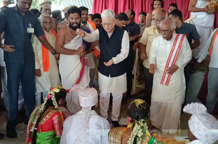 అచ్చంపేట: వివిధ ప్రాంతాలకు చెందిన చెంచు గిరిజన ఆదివాసి జంటలకు ఒకే వేదికపై సామూహిక వివాహాలు నిర్వహించడం ప్రశంసనీయమని తెలంగాణ రాష్ట్ర గవర్నర్ జిష్ణుదేవ్ వర్మ(Governor Jishnu Dev Verma) అన్నారు. ఆదివారం నాగర్ కర్నూల్ జిల్లా అచ్చంపేట పట్టణంలోని ఓ ఫంక్షన్ హాల్ లో వనవాసి కళ్యాణ పరిషత్ తెలంగాణ శాఖ ఆధ్వర్యంలో 111 చెంచు గిరిజన జంటలకు సామూహిక వివాహాలు నిర్వహించారు. కార్యక్రమానికి ముఖ్యఅతిథిలుగా రాష్ట్ర గవర్నర్ హాజరై నూతన దంపతులను ఆశీర్వదించారు. గవర్నర్ తో పాటు హైకోర్టు జడ్జి మాధవి దేవి, హర్యానా మాజీ గవర్నర్ బండారు దత్తాత్రేయ, ఆదివాసి కళ్యాణ ఆశ్రమం అఖిల భారత కార్యకారిణి రేఖ నాగర్, ప్రాంత అధ్యక్షులు కాట్రాజు వెంకటయ్య తదితరులు నూతన వధూవరులను ఆశీర్వదించారు.