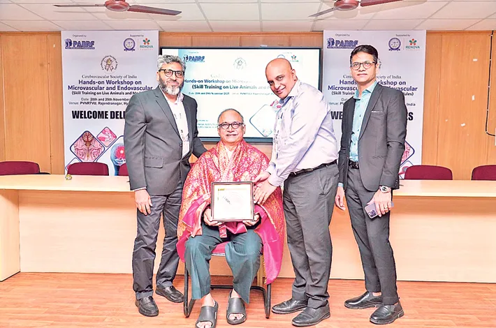 హైదరాబాద్(రాజేంద్రనగర్), నవంబర్ 28 (విజయక్రాంతి): తొలి ఎడిషన్ అద్భుతమైన విజయాన్ని సాధించిన స్ఫూర్తితో రెనో వా ఇనిస్టిట్యూట్ ఆఫ్ న్యూరోలాజికల్ సైన్సె స్ (ఆర్ఐఎన్ఎస్), పాన్ రీసెర్చ్ ఫౌండేషన్, ప్రతిష్ఠాత్మకమైన సెరెబ్రోవాస్క్యులర్ సొసైటీ ఆఫ్ ఇండియా (సీవీఎస్ఐ), పీవీ నరసింహారావు తెలంగాణ వెటర్నరీ యూనివర్సిటీ సంయుక్తాధ్వర్యంలో రాజేంద్రనగర్లోని కాలేజ్ ఆఫ్ వెటర్నరీ సైన్స్లో రెండవ హ్యాం డ్స్-ఆన్ వర్క్షాప్ శుక్రవారం ఘనంగా ప్రారంభమైంది. మైక్రోవాస్క్యులర్ అండ్ ఎండోవాస్క్యులర్ స్కిల్ ట్రైనింగ్ ఆన్ లైవ్ యానిమల్స్ అండ్ మాడ్యూల్స్’ అనే అం శంపై జరుగుతున్న ఈ వర్క్షాప్ శనివా రం కూడా కొనసాగుతోంది. ఈ వర్క్షాప్లో దేశవ్యాప్తంగా 60 మందికి పైగా న్యూరోసర్జన్ ఫెలోలు, రెసిడెంట్లు హాజరయ్యారు.