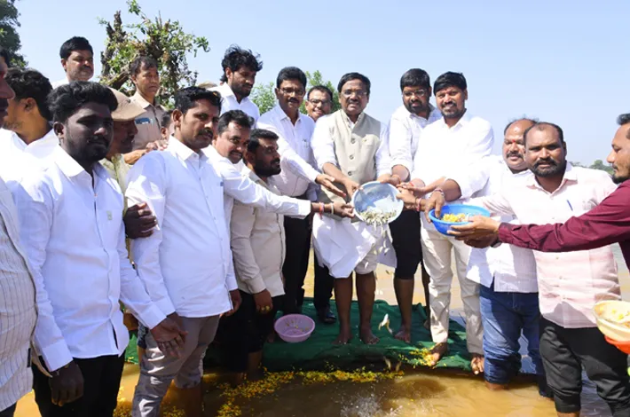 హైదరాబాద్: భీమారం మండలంలోని గొల్లవాగు ప్రాజెక్టులో మత్స్యశాఖ ఆధ్వర్యంలో ఉచిత చేప పిల్లలను కార్మిక మైనింగ్ శాఖ మంత్రి వివేక్ వెంకటస్వామి విడుదల చేశారు. మత్స్యకారుల అభివృద్ధికి ప్రభుత్వం 100 శాతం రాయితీపై రిజర్వాయర్లు, చెరువులు, వాగులు, గుంటల్లో ఉచితంగా చేప పిల్లలు విడుదల చేస్తుందని మంత్రి పేర్కొన్నారు. ఈ సందర్భంగా మంత్రి వివేక్ మాట్లాడుతూ... ప్రోటీన్ కావాలంటే చేపలు తినాలని, అందులో న్యూట్రిషన్ ఉంటుందన్నారు. గొల్లవాగు ప్రాజెక్టును మా నాన్న కాక వెంకటస్వామి కట్టించారని గుర్తు చేసుకున్నారు.
