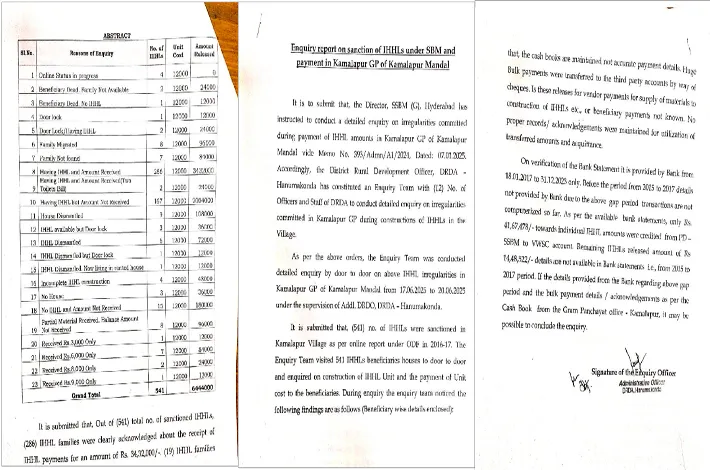 హనుమకొండ, ఫిబ్రవరి 20(విజయ క్రాంతి):హనుమకొండ జిల్లాలోని కమలాపూర్ మండలం పరిధిలో మరుగుదొడ్ల నిర్మాణంలో భారీ స్థాయిలో అవినీతి జరిగినట్లు అధికారిక విచారణ నివేదికలో తేలింది. కేంద్ర ప్రభుత్వ పథకమైన స్వచ్ఛ భారత్ మిషన్ కింద 201618 మధ్య వందలాది మరుగుదొడ్లు నిర్మించినట్లు రికార్డుల్లో చూపించి వాస్తవంగా నిర్మాణాలు జరగకుండానే ప్రభుత్వ నిధులను అధికారులు దుర్వినియోగం చేసినట్లు వెళ్లడైంది.