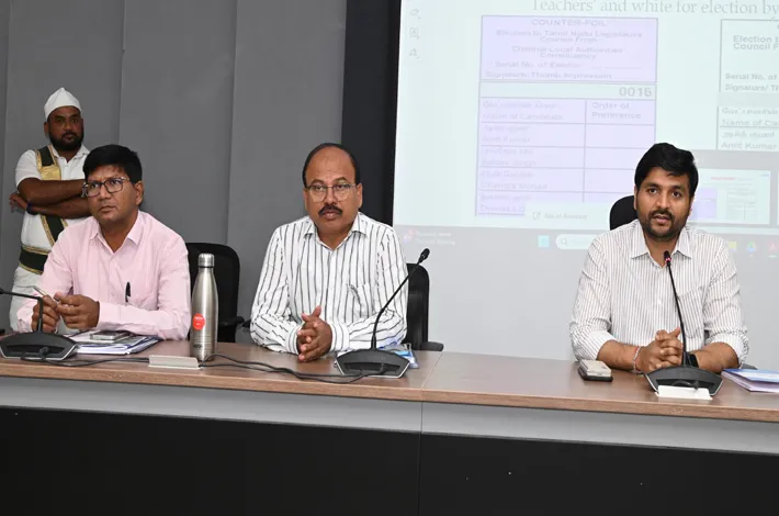 కుమ్రం భీం ఆసిఫాబాద్ (విజయక్రాంతి): శాసనమండలి నియోజకవర్గ ఎన్నికల పోలింగ్ ప్రక్రియను ఎలాంటి పొరపాట్లు లేకుండా పారదర్శకంగా నిర్వహించాలని జిల్లా ఎన్నికల అధికారి, కలెక్టర్ వెంకటేష్ దోత్రే అన్నారు. సోమవారం జిల్లా కేంద్రంలోని సమీకృత జిల్లా కలెక్టరేట్ భవన సమావేశ మందిరంలో జిల్లా అదనపు కలెక్టర్ (రెవెన్యూ) డేవిడ్, ఆసిఫాబాద్ రాజస్వ మండల అధికారి లోకేశ్వర్ రావులతో కలిసి కరీంనగర్ ఉపాధ్యాయ, పట్టభద్రుల శాసనమండలి ఎన్నికల నిర్వహణపై సమీక్ష సమావేశం నిర్వహించారు. ఈ సందర్భంగా జిల్లా ఎన్నికల అధికారి, కలెక్టర్ మాట్లాడుతూ... ఎమ్మెల్సీ ఎన్నికల పోలింగ్ ప్రక్రియలో ఎలాంటి పొరపాట్లు జరగకుండా అధికారులు, సిబ్బంది అప్రమత్తంగా ఉంటూ బాధ్యతాయుతంగా విధులు నిర్వహించాలని తెలిపారు. ప్రిసైడింగ్ అధికారి పోలింగ్ కేంద్రంలో పోలింగ్ ప్రక్రియ సజావుగా సాగేలా పర్యవేక్షించాలని, ప్రిసైడింగ్ అధికారి డైరీపై పూర్తిగా అవగాహన కలిగి ఉండాలని తెలిపారు.