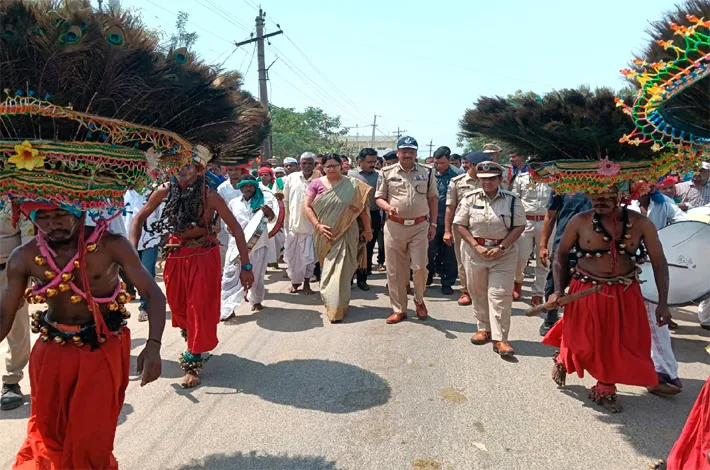 మండల కేంద్రానికి వచ్చిన రాష్ట్ర డిజిపి బీ శివధర్ రెడ్డి జిల్లా కలెక్టర్ అభిలాష అభినవ్ ఎస్పీ జానకి షర్మిల కు ఆదివాసి సంప్రదాయ పద్ధతిలో గుస్సాడీ ముత్యాలతో స్వాగతం పలికారు. మొదట డాక్టర్ బిఆర్ అంబేద్కర్ విగ్రహానికి పూజలు చేసి పూలమాల వేసి నివాళులు అర్పించారు. అనంతరం పోలీస్ శాఖ నిర్వహిస్తున్న ఆరైవ్ అలైన్ కార్యక్రమానికి వస్తున్న వారికి విద్యార్థులు యువకులు పూల వర్షం తో స్వాగతం పలికారు. ఈ సందర్భంగా ఆయన మాట్లాడుతూ తెలంగాణ రాష్ట్రాన్ని ప్రమాదరహిత రాష్ట్రంగా మార్చేందుకు పోలీస్ శాఖ కృషి చేస్తుందన్నారు. రాష్ట్రంలో రోడ్డు ప్రమాదాల కారణంగా ఎక్కువగా యువత చనిపోతున్నారని దీనికి అనేక కారణాలు ఉన్న రోడ్డు నిబంధనలు పాటించకపోవడమే ముఖ్య కారణమన్నారు.
