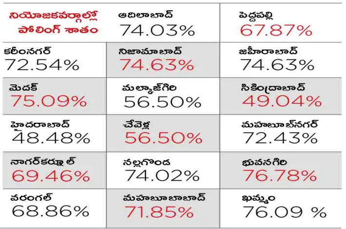 ఈసారి భువనగిరి లోక్సభ పరిధిలో అత్యధికంగా 76.78 శాతం ఓటింగ్ నమోదయ్యిందని వికాస్రాజ్ తెలిపారు. అత్యల్పంగా హైదరాబాద్లో 48.48 శాతం నమోదైనట్లు వెల్లడించారు. అసెంబ్లీ నియోజకవర్గాలుగా చూస్తే మెదక్ పార్లమెంట్ పరిధిలోని నర్సాపూర్లో 84.25 శాతం, అత్యల్పంగా హైదరాబాద్ పార్లమెంట్ పరిధిలోని మలక్పేటలో 42.76 శాతం పోలింగ్ నమోదయిందని వివరించారు. ఓట్ల పరంగా చూస్తే మల్కాజిగిరి లోక్సభ పరిధిలోని మేడ్చల్ అసెంబ్లీ నియోజకవర్గంలో అత్యధికంగా 3,85,149 ఓట్లు పోల్ కాగా, అత్యల్పంగా మహబూబాబాద్ పార్లమెంట్ పరిధిలోని భద్రాచలం అసెంబ్లీ సెగ్మెంట్లో 1,05,383 ఓట్లు పోలైనట్లు చెప్పారు.