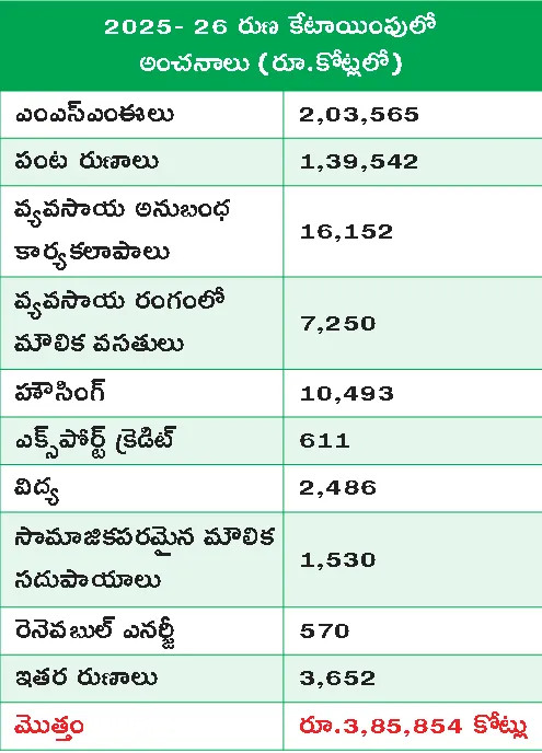 ముఖ్యంగా వ్యవసాయ రంగంలో మౌలిక వసతుల కల్పన, ఆహార ప్రాసె సింగ్, ఎంఎస్ఎంఈలు, పునరుత్పాదక ఇంధనం, గ్రామీణ గృహనిర్మాణం, సామాజికపరమైన మౌలిక సదుపాయా ల వంటి కీలక రంగాలకు ఈతమివ్వాలనే నిశ్చయానికి వచ్చి ‘తెలంగాణ స్టేట్ ఫోకస్ పేపర్ -2025’ పేరుతో శుక్రవా రం వార్షిక రుణ ప్రణాళికను విడుదల చేసింది.