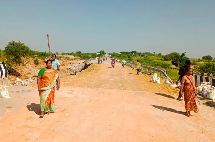 అచ్చంపేట: తుఫాను ప్రభావంతో కురిసిన భారీ వర్షాలకు హైదరాబాద్- శ్రీశైలం(Hyderabad-Srisailam National Highway) మార్గంలోని డిండి సమీపంలోని 765 జాతీయ రహదారి భారీగా కోతకు గురైన విషయం తెలిసిందే. దీంతో హైదరాబాద్ నుంచి అచ్చంపేట, శ్రీశైలం వెళ్లే వాహనాలను కొండారెడ్డిపల్లి, ఉప్పునుంతల, హాజీపూర్ మీదుగా దారి మళ్లిస్తున్నారు. వాహనాల ప్రతిని దృష్టిలో ఉంచుకొని జాతీయ రహదారి నిర్వాహకులు కోతకు గురైన రహదారికి మరమ్మతు పనులను ప్రారంభించారు. నీటి ఉదృత్తో కొట్టుకుపోయిన రోడ్డుపై మొరం, కంకరతో ఆ మార్గాన్ని పునర్దించే పనులను చేపట్టారు. పనులు దాదాపుగా పూర్తికా వచ్చినట్లు నిర్వాహకులు తెలిపారు. అతి త్వరలోనే వాహనాల రాకపోకలకు అనుమతించే అవకాశం ఉన్నట్లు తెలుస్తోంది.