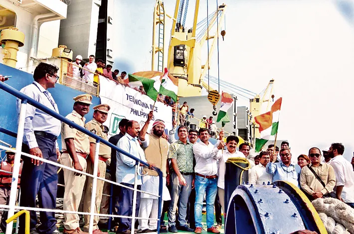 పౌరసరఫరాల శాఖ మంత్రి ఉత్తమ్కుమార్రెడ్డి సోమవారం ఏపీలోని కాకినాడ పోర్ట్ నుంచి ఫిలిప్పీన్స్కు బియ్యం తీసుకెళ్తున్న నౌకను జెండా ఊపి ప్రారంభించారు. మంత్రి మాట్లాడుతూ.. ఇతర దే శాలకు కూడా బి య్యం ఎగుమతి చే సేందుకు తెలంగాణ ప్రభుత్వం సంప్రదింపులు జ రుపుతున్నదని పేర్కొన్నారు.