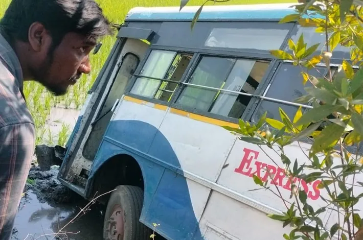 హైదరాబాద్: రాజన్నసిరిసిల్ల గంభీరావుపేట మండలం(Rajanna Sircilla Gambhiraopet Mandal) గోరంటాల శివారులో శుక్రవారం టీఎస్ఆర్టీసీ బస్సు(TSRTC Bus) అదుపు తప్పి వ్యవసాయ పొలాల్లోకి దూసుకెళ్లడంతో ప్రయాణికులకు గాయాలయ్యాయి. కామారెడ్డి డిపో బస్సు సిరిసిల్ల వెళ్తుండగా ఈ ఘటన జరిగింది. బస్సు గ్రామ వంతెన మలుపు వద్దకు చేరుకున్నప్పుడు, దాని టైర్లలో ఒకటి పగిలిపోవడంతో డ్రైవర్ స్టీరింగ్(Driver steering)పై నియంత్రణ కోల్పోయాడు. దీంతో వాహనం వ్యవసాయ పొలాల్లో(Agricultural fields)కి దూసుకుపోయింది. బాటసారులు సంఘటనా స్థలానికి చేరుకుని ప్రయాణికులను రక్షించారు. కొంతమంది ప్రయాణికులకు గాయాలయ్యాయి. ఓవర్లోడింగ్(Overloading) వల్లే ప్రమాదం జరిగినట్లు అనుమానిస్తున్నారు. గాయపడిన వారిని సమీప ఆస్పత్రికి తరలించారు. విషయం తెలుసుకున్న పోలీసులు ఘటనాస్థలికి చేరుకుని దర్యాప్తు చేపట్టారు.