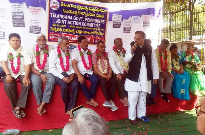ప్రభుత్వం స్పందించి తమ బకాయిలను వెంటనే విడుదల చేయాలని డిమాండ్ చేశారు. కాగా పెన్షనరీ బెనిఫిట్స్ చెల్లించాలని కోరు తూ హైదరాబాద్ ఇందిరాపార్క్ ధర్నా చౌక్లో నిరాహార దీక్షలో జేఏసీ చైర్మన్ లక్ష్మయ్య మాట్లాడారు. నల్లగొండ కలెక్టరేట్ వద్ద రిలే నిరాహార దీక్షలో కొంపెల్లి భిక్షపతి పాల్గొన్నారు.