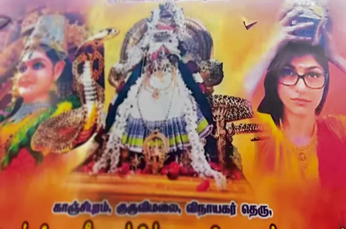 కాంచీపురం (తమిళనాడు): తమిళనాడులోని కాంచీపురం జిల్లాలో హిందువులు ఎంతో ప్రతిష్ఠాత్మకంగా నిర్వహించే ఆడి పండుగ (పార్వతి దేవిని పూజించే)కోసం ఆలయం వద్ద ఏర్పాటు చేసిన హోర్డింగ్పై మాజీ పోర్న్ స్టార్ మియా ఖలీఫా ఫొటో కనిపించడం వివాదానికి దారి తీసింది. ఈ హోర్డింగ్ ఫొటోలు సోషల్ మీడియాలో వైరల్ కావడంతో అమ్మవారి భక్తులు ఆగ్రహం వ్యక్తం చేస్తున్నారు. ఆడి పండుగ కోసం కురువిమలైలోని నాగతమ్మన్, సెల్లియమ్మన్ ఆలయాల వద్ద పండుగ దీపాలతో పాటు హోర్డింగ్లను ఏర్పాటు చేశారు.