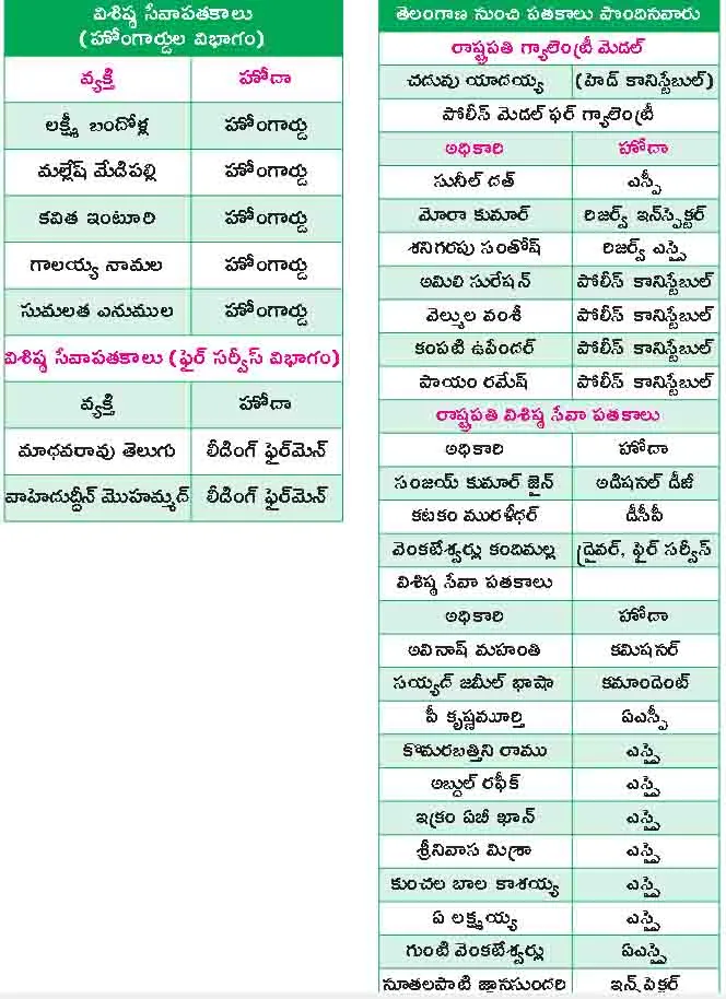 ఈ ఏడాది మొత్తం 1037 మందికి పతకాలు ప్రదానం చేయనున్నారు. ఇందులో 208 మందికి పోలీస్ మెడల్స్ ఫర్ గ్యాలంట్రీ, 75 మందికి రాష్ర్టపతి విశిష్ఠ సేవా పతకాలు, 624 మందికి పోలీసు విశిష్ఠ సేవా (మెడల్ ఫర్ మెరిటోరియస్ సర్వీస్) పతకాలను అందజేయను న్నారు. ఈ పురస్కారాల్లో రాష్ట్రం నుంచి 29 మందికి పతకాలు లభించాయి. ఒకరికి రాష్ర్టపతి గ్యాలం ట్రీ పతకం, ఏడుగురికి మెడల్ ఫర్ గ్యాలంట్రీ, ముగ్గురికి రాష్ర్టపతి విశిష్ఠ సేవా పతకం, 18 మందికి పోలీసు విశిష్ఠ సేవా పతకాలు లభించాయి.