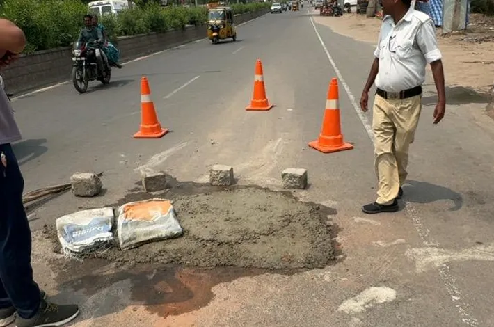 రహదారిపై గుంత పూడ్చిన ట్రాఫిక్ హోమ్ గార్డ్...