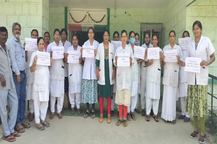తుంగతుర్తి( విజయ క్రాంతి): సూర్యాపేట జిల్లా తుంగతుర్తి మండలంలోనీ తెలంగాణ వైద్య విధాన పరిషత్ లో పనిచేస్తున్నట్టు వైద్య సిబ్బందికి ప్రతినెల 1 తేదీన తమ యొక్క జీత బద్యాలు ఇవ్వాలని శుక్రవారం తుంగతుర్తి ఏరియా హాస్పిటల్ నందు ఆసుపత్రి సిబ్బంది నిరసన వ్యక్తం చేశారు. ఈ సందర్భంగా పలువురు మాట్లాడుతూ ప్రతినెల మొదటి రోజున రాకపోవడంతో, ఈఎంఐ లతో ఇబ్బంది పడుతున్నామని ఆవేదన వ్యక్తం చేశారు. ఈ కార్యక్రమంలో నర్సింగ్ ఇంచార్జ్ ఆఫీసర్ అరుణకుమారి కర్ణకరె సువర్ణ నాగమణి కవిత ఉపేంద్ర సంధ్య సుజిత అరుణ పూలమ్మ స్వాతి తదితరులు పాల్గొన్నారు