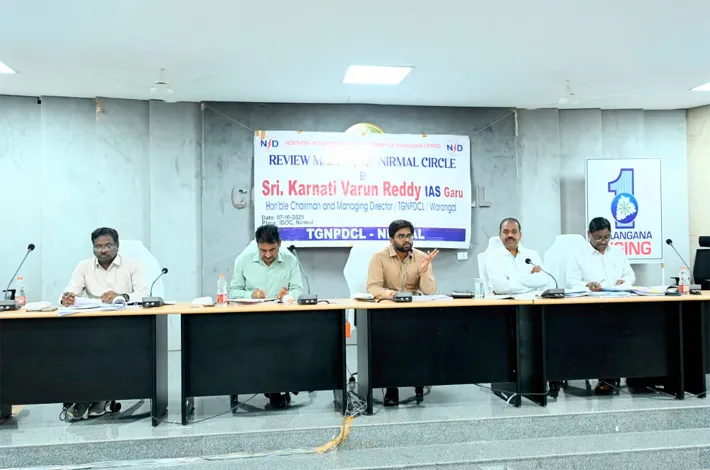 నిర్మల్, అక్టోబర్ 7 (విజయక్రాంతి): ప్రజలకు మెరుగైన విద్యుత్ సేవలు అందివ్వాల ని టీజీ. ఎన్.పి.డి.సి.ఎల్ సిఎండి కర్నాటి వరుణ్ రెడ్డి, విద్యుత్ శాఖ అధికారులను ఆదేశించారు. మంగళవారం కలెక్టరేట్ లో ని సమావేశ మందిరంలో టీజీ. ఎన్.పి.డి.సి. ఎల్ చైర్మన్, మేనేజింగ్ డెరైక్టర్ కర్నాటి వరుణ్ రెడ్డి, విద్యుత్ శాఖ అధికారులతో, ఆ శాఖపై సమీక్షా సమావేశం నిర్వహించారు. ఈ సందర్భంగా ఆయన మాట్లాడుతూ, జిల్లాలో విద్యుత్ వినియోగంపై వివరాలను అధికారులను అడిగి తెలుసుకున్నారు.