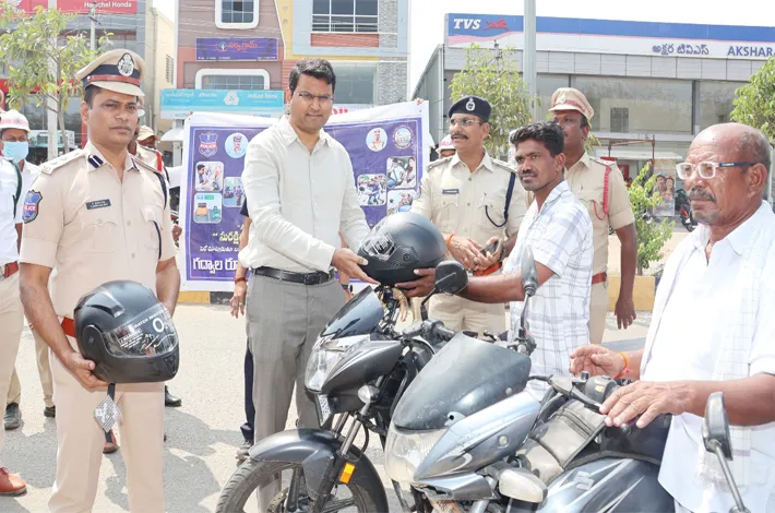 వాహనదారులకు హెల్మెట్లు అందజేత