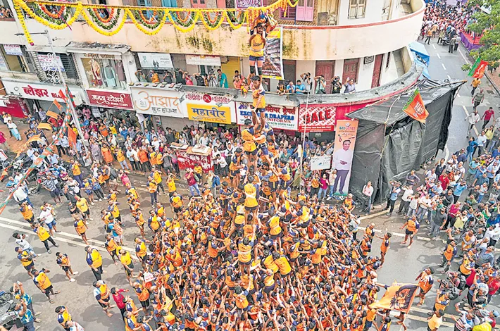 ముంబై, ఆగస్టు 27: మహారాష్ట్ర వ్యాప్తంగా శ్రీకృష్ణ జన్మాష్టమి వేడుకలు ఏటా అంగరంగ వైభవంగా జరుగుతాయి. ముఖ్యంగా ముంబై ఇందుకు ప్రధాన వేదిక. ప్రతి వీధిలో ఉట్టికొట్టే కార్యక్రమం ఘనంగా నిర్వహిస్తారు. ఇక్కడ దహీ హండీగా పిలుస్తారు. ఐదారు అంతస్తుల ఎత్తులో ఉట్టిని కట్టి దాన్ని పగలకొట్టేందు కు మానవ పిరమిడ్లుగా ఏర్పడుతారు. ఇది చూసేందుకు భయం అనిపించినా ఎంతో ఆసక్తికరంగా ఉంటుంది. చాలామంది ఔత్సాహికులు, యువతీయువకులు ఉత్సాహంగా ఈ వేడుకల్లో పాల్గొంటారు. ఈ చిత్రం ముంబైలోని దాదర్లో తీసింది.