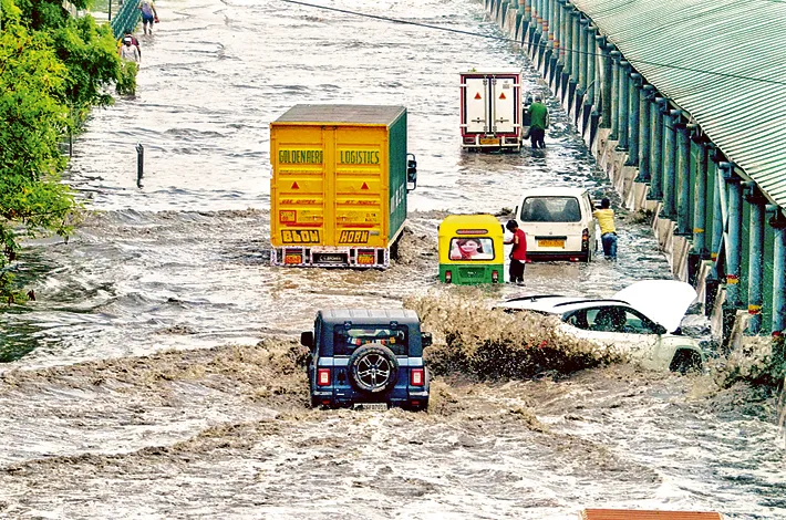 దేశ రాజధాని ఢిల్లీ, దాని చుట్టుపక్కల వానలు దంచి కొడుతున్నాయి. కుంభ వృష్టితో రోడ్లన్నీ చెరువులు, నదులను తలపిస్తున్నాయి. ఎక్కడ అడుగుపెడితే ఏమవుతుందో తెలియక ప్రజలు భయభయంగా బతుకుతున్నారు. ఆదివారం కురిసిరిన భారీ వర్షానికి గురుగ్రామ్లోని ఓ రోడ్డుపై చేరిన వరద నీటిలో అవస్తలు పడుతూ వెళ్తున్న వాహనదారులు.