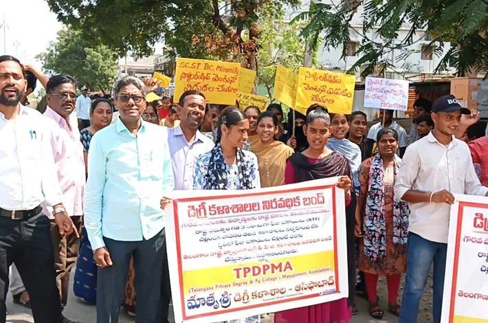 కుమ్రంభీం ఆసిఫాబాద్, (విజయక్రాంతి): రాష్ట్ర ప్రభుత్వం ప్రైవేటు డిగ్రీ జూనియర్ కళాశాలలకు రావాల్సిన స్కాలర్షిప్ బకాయిలు విడుదల చేయాలని డిమాండ్ చేస్తూ రాష్ట్ర వ్యాప్తంగా చేపడుతున్న నిరసనలో భాగంగా బుధవారం ప్రైవేటు కళాశాల యజమాన్యాల ఆధ్వర్యంలో విద్యార్థులు శాంతియుత ర్యాలీ నిర్వహించారు. ఈ సందర్భంగా యజమాన్యల ప్రతినిధులు మాట్లాడుతూ.. పెండింగ్ లో ఉన్న స్కాలర్షిప్ లను వెంటనే ప్రభుత్వం విడుదల చేయాలని డిమాండ్ చేశారు. ప్రభుత్వం నిధులు విడుదల చేయకపోవడంతో కళాశాలల నిర్వహణ కష్టతరంగా మారిందని ఆవేదన వ్యక్తం చేశారు. ప్రభుత్వం స్పందించి నిధులు విడుదల చేయకపోతే ఆందోళన కార్యక్రమాలను ఉదృతం చేస్తామని స్పష్టం చేశారు.