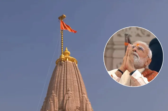 ఉత్తరప్రదేశ్: అయోధ్యలో రామాలయం ధ్వజారోహణం(PM Modi Ayodhya Temple Flag Hoisting) వైభవంగా జరిగింది. ఆలయ శిఖరంపై ప్రధాని నరేంద్ర మోదీ కాసాయపతాకాన్ని ఆవిష్కరించారు. అభిజిత్ ముహూర్తంలో రామాలయ శిఖరంపై ధ్వజారోహణం చేశారు. అయోధ్య రామమందిర నిర్మాణం ధ్వజారోహణంతో సంపూర్ణమైంది. 2020 ఆగస్టు 5న రామమందిరం నిర్మాణానికి భూమి పూజ చేశారు. అయోధ్యలో 2024 జనవరి 22న బాలరాముడి ప్రాణప్రతిష్ఠ జరిగింది. ధర్మధ్వజంపై శ్రీరాముడు, సూర్యుడు, ఓం, కోవిదర చెట్టు చిహ్నాలున్నాయి. జెండాపై రాముడి తేజస్సు, శౌర్యాన్ని సూచించేలా చిహ్నాలున్నాయి. అపూర్వ ఘట్టానికి 7 వేల మంది ప్రత్యేక అతిథులు హాజరయ్యారు. అయోధ్య బాలరాముడికి ప్రధాని ప్రత్యేక పూజలు చేశారు.