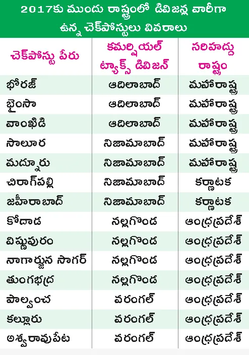 రాష్ట్రంలో 2017కు ముందు వరకు 14 చెక్పోస్టులు చలామణిలో ఉండేవి. వీటిలో ఆదిలాబాద్ డివిజన్లోని భోర జ్ మినహా మిగతా 13 చెక్పోస్టులను అద్దె స్థలాల్లోనే కమర్షియల్ ట్యాక్స్ నిర్వహించేది. 2017లో పన్నుల విధానంలో పారదర్శకత కోసం కేంద్రం జీఎస్టీని తీసుకొచ్చింది. ఆ తర్వాత చెక్పోస్టులను ఎత్తివేశారు. అప్పటి నుంచి రాష్ట్రంలోని 14 చోట్ల ఎలాంటి కార్యకలాపాలు లేవు.