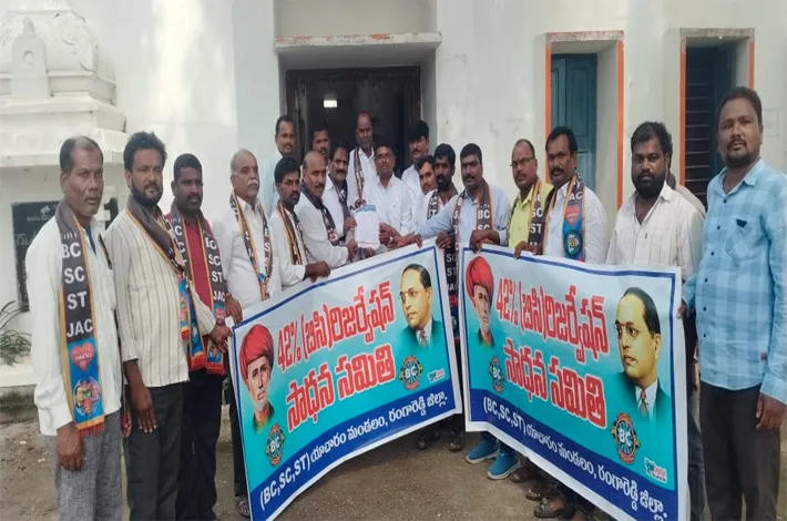 యాచారం నవంబర్ 3 : బీసీల 42 శాతం రిజర్వేషన్ అమలు చేయాలని, కేంద్ర, రాష్ర్ట ప్రభుత్వలు దీనిపై వెంటనే ఆమోదం తెలపాలని సీనియర్ అడ్వకేట్ ముక్తాల యాదయ్య గౌడ్ డిమాండ్ చేశారు.42 శాతం బీసీ రిజర్వేషన్ సాధన సమితి కమిటీ పిలుపుమేరకు బిసి ఎస్సి, ఎస్టి జేఏసీ ఆధ్వర్యంలో సోమవారం యాచారం తహశీల్దార్ కార్యాలయంలో ఎమ్మార్వోకి 42 శాతం రిజర్వేషన్ సాధనకు వినతిపత్రం అందజేశారు.ఈ సందర్భంగా జేఏసీ నేతలు మాట్లాడుతూ.
