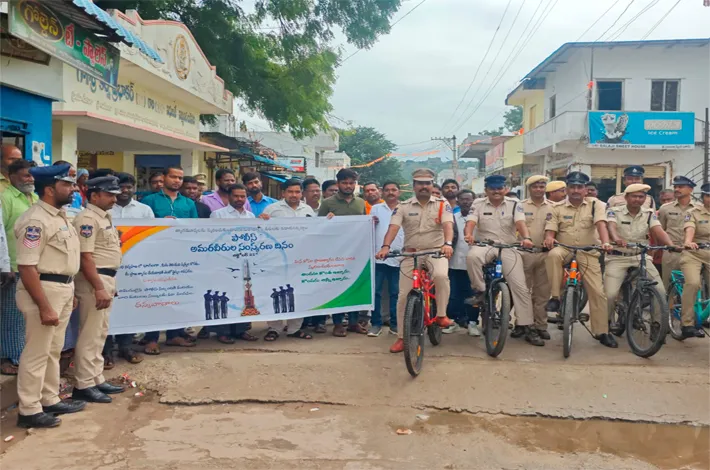 సంస్థాన్ నారాయణపూర్, అక్టోబర్ 28 (విజయక్రాంతి): విధి నిర్వహణలో అమరులైన పోలీసుల త్యాగాలు మరువలేనివని వారి ఆశయాలను సాధిస్తామని సంస్థాన్ నారాయణపూర్ ఎస్త్స్ర జె.జగన్ అన్నారు. మంగళవారం పోలీసు అమరుల సంస్మరణ వారోత్సవాల సందర్భంగా మండల కేంద్రంలోని ప్రభుత్వ జూనియర్ కాలేజీ విద్యారు లతో కలిసి సైకిల్ ర్యాలీ నిర్వహించారు.