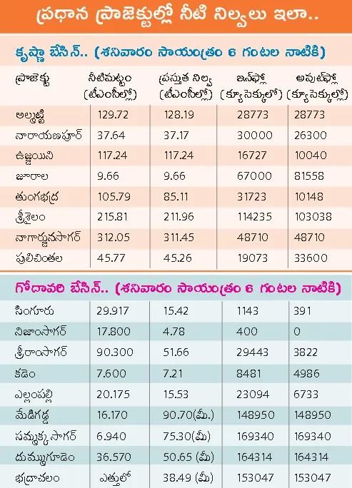 దీంతో ప్రాజెక్టు అధికారులు రెండు గేట్లు ఎత్తి 4,948 క్యూసెక్యుల జలాలను కడెం వాగులోకి వదిలారు. స్వర్ణ ప్రాజెకులోకి 1,500 క్యూసెక్యుల వరద చేరుతుండగా, అంతే మొత్తంలో ఒక గేటు ఎత్తి దిగువకు నీరు వదులుతున్నారు. గడ్డెన్న వాగు పూర్తిస్థాయి నీటిమట్టం 358 అడుగులు కాగా, ప్రస్తుతం నీటిమట్టం 357.80 అడుగులకు చేరింది. అలాగే కృష్ణా బేసిన్ నల్లగొండ జిల్లా పరిధిలోని నాగార్జున సాగర్ ప్రాజెక్టు నిండు కుండను తలపిస్తోంది. 400 అడుగుల పైనుంచి 26 క్రస్టుగేట్ల ద్వారా జలాలు కిందికి వస్తుండడంతో.. ఆ దృశ్యాన్ని పాలధారను తలపిస్తూ పర్యాటకులను ఆకర్షిస్తున్నది.