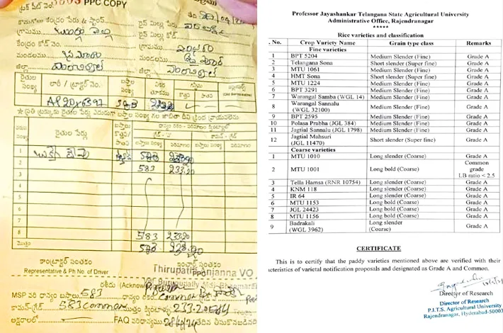 ప్రొఫెసర్ జయశంకర్ తెలంగాణ స్టేట్ (పీజేటీఎస్) అగ్రికల్చర్ యూనివర్సిటీ ఫైన్ వెరైటీ, కోర్స్ వెరైటీలను ప్రకటించింది. ఫైన్ వెరైటీలైన బీపీటీ 5204, తెలంగాణ సోనా, ఎంటీయూ 1061, హెచ్ఎంటీ సోనా, ఎంటీయూ 1224, బీపీటీ 3291, వరంగల్ సాంబ, వరంగల్ సన్నాలు (32,100), బీపీటీ 2595, పొలాస ప్రభ (జేజీఎల్ 384), జగిత్యాల సన్నాలు (జేజీఎల్ 1798), జగిత్యాల మసూరి (జేజీఎల్ 11470) లు గ్రేడ్ ‘ఏ’ కింద ప్రకటించారు. అలా గే కోర్స్ వెరైటీలైన ఎంటీయూ 1010, తెల్ల హంస (ఆర్ఎన్ఆర్ 10754), కేఎన్ఎం 118, ఐఆర్ 64, ఎంటీయూ 1153, జేజీఎల్ 24423, ఎంటీయూ 1156, భద్రకాళి (డబ్ల్యూజీఎల్ 3962) గ్రేడ్ ‘ఏ’ కాగా ఎంటీయూ 1001, ఇతర హైబ్రీడ్ విత్తనాలు కామన్ రకానికి చెందినవిగా ప్రకటించారు.