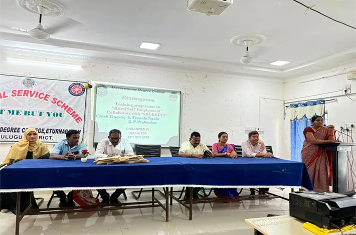 ఏటూరునాగారం, అక్టోబరు23(విజయక్రాంతి): ములుగు జిల్లా ఏటూరునాగారం మండల కేంద్రంలో స్థానిక ప్రభుత్వ డిగ్రీ కళాశాలలో ఐక్యుఏసి మరియు ఈడిసి విభాగాల ఆధ్వర్యంలో ’గ్రామీణ స్వయం ఉపాధి శిక్షణ అవగాహన కార్యక్రమంను నిర్వహించారు.