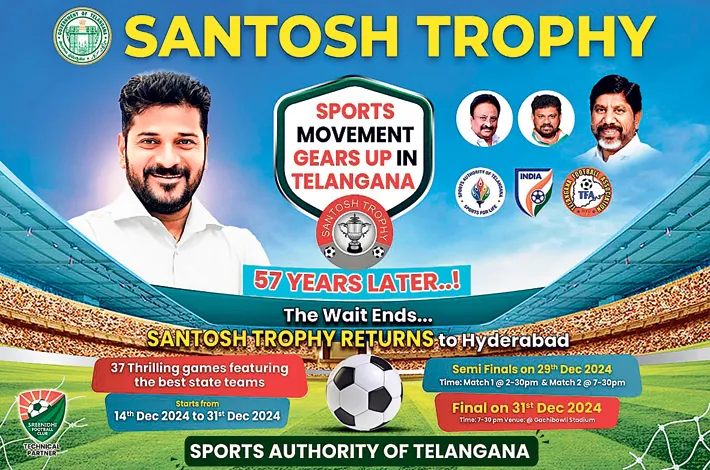 హైదరాబాద్: నేటి నుంచి ఈ నెల 31 వరకు ఆల్ ఇండియా ఫుట్బాల్ ఫెడరేషన్ ఆధ్వర్యంలో 78వ సంతోష్ ట్రోఫీ -ఫుట్బాల్ మ్యాచ్లు జరగనున్నాయి. దాదాపు 57 ఏండ్ల తర్వాత సంతోష్ ట్రోఫీ మ్యాచ్లు హైదరాబాద్లో జరుగుతున్నాయి. ఇందుకు కావాల్సిన అన్ని ఏర్పాట్లను క్రీడా ప్రాధికార సంస్థ పూర్తి చేసింది. 12 జట్లను రెండు గ్రూపులుగా విభజించారు. 31వ తేదీన ఫైనల్ మ్యాచ్కు గచ్చిబౌలి స్టేడియం ఆతిథ్యం ఇవ్వనుంది. తెలంగాణ గ్రూప్ ఉంది.