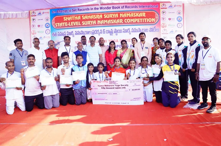 సిద్దిపేట జిల్లా యోగాసన స్పోర్ట్స్ అసోసియేషన్, వ్యాస మహర్షి యోగా సొసైటీ ఆధ్వర్యంలో శత సహస్ర సూర్య నమస్కారాల ప్రదర్శన జాతీయస్థాయిలో రికార్డు నెలకొల్పింది. రాష్ట్ర యోగ అధ్యయన పరిషత్ సభ్యులు, జాతీయ యోగ మెడలిస్ట్ , ప్రముఖ యోగ గురువు తోట సతీష్ నేతృత్వంలో ప్రదర్శన , రాష్ట్రస్థాయి పోటీలు జరిగాయి. 25 సంవత్సరాల లోపు, 25 సంవత్సరాల పై వయస్సు వారికి వేరువేరుగా రాష్ట్రస్థాయి పోటీలు నిర్వహించారు. పురుషులకు, మహిళలకు వేరువేరుగా పోటీలు జరిగాయి. నాలుగు విభాగాల్లో జరిగిన పోటీల్లో ఐదు సంవత్సరాల నుంచి మొదలుకొని 72 సంవత్సరాల వయసు ఉన్న వారు ఉత్సాహంగా పాల్గొని ఉత్తేజాన్ని నింపారు. వండర్ బుక్ ఆఫ్ రికార్డు ప్రదర్శనలో పాల్గొన్న విద్యార్థులకు, యోగసాధకులకు అతిథులు మెడల్ , సర్టిఫికెట్లను ప్రధానం చేశారు.