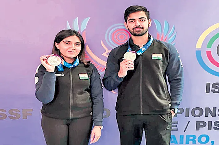 కైరో, నవంబర్ 11: ఐఎస్ఎస్ఎఫ్ వరల్డ్ షూటింగ్ చాంపియన్షిప్లో భారత్ షూట ర్లు సత్తా చాటుతున్నారు. వ్యక్తిగత విభాగాల్లో అదరగొట్టిన మన షూటర్లు తాజాగా టీమ్ ఈవెంట్స్లోనూ పతకాలు గెలిచారు. 10 మీటర్ల ఎయిర్ పిస్టల్ మిక్సిడ్ టీమ్ ఈవెంట్లో ఇషా సింగ్, సామ్రాట్ రాణా జోడీ రజత పతకం సాధించింది .సోమవారం వ్యక్తిగత విభాగంలో స్వర్ణం గెలిచి చరిత్ర సృష్టించిన సామ్రాట్, ఇషాతో కలిసి మిక్సిడ్ టీమ్ ఈవెంట్లో చివరి వరకూ పోరాడినా రెండో స్థానంతో సరిపెట్టుకోవాల్సి వచ్చింది.