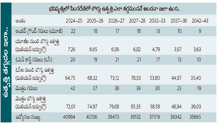 ప్రస్తుతం సింగరేణిలో 22 అండర్ గ్రౌండ్ మైన్లు, 20 ఓపెన్ కాస్ట్ గనులు ఉన్నాయి. అయితే 2024 7 గనులు మూసివేయనుండగా కేవలం మూడు మాత్రమే కొత్తగా ఏర్పడనున్నాయి. అలాగే 2025 ఒకటి మూసివేసి రెండు కొత్తవి తెరుస్తారు. 2027 మొత్తం 10 గనులు మూసివేసి రెండు మాత్రమే కొత్తవి తెరుస్తారు. 2032 మొత్తం 7 గనులు మూతపడనుండగా.. కొత్తగా 11 గనులు తెరుస్తారు. అయితే 2037 నాల్గు, 2042 మొత్తం 6 గనులు మూతపడనున్నాయి. దీంతోఆ యేడాదికి కేవలం 19 గనులు మాత్రమే సింగరేణి పరిధిలో మిగులుతాయి.