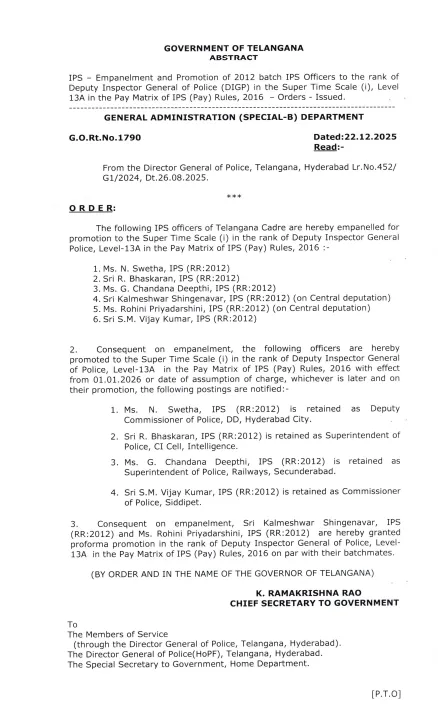 హైదరాబాద్: తెలంగాణ క్యాడర్కు చెందిన ఆరుగురు ఐపీఎస్(IPS) అధికారులను డిప్యూటీ ఇన్స్పెక్టర్ జనరల్ ఆఫ్ పోలీస్ హోదాకు పదోన్నతి కల్పించేందుకు ఎంప్యానెల్ చేశారు. ఈ మేరకు ప్రభుత్వ ప్రధాన కార్యదర్శి(Chief Secretary to the Government) కె. రామకృష్ణారావు ఒక ఉత్తర్వు జారీ చేశారు. పదోన్నతులు పొందిన ఐపీఎస్ అధికారుల్లో ఎన్ శ్వేత, ఆర్ భాస్కరన్, జి చందన దీప్తి, కల్మేశ్వర్ శింగెనవర్, రోహిణి ప్రియదర్శిని, ఎస్ఎం. విజయ్ కుమార్. పదోన్నతి పొందిన వారిలో, కింది పోస్టింగ్లను కేటాయిస్తూ ఉత్తర్వులు జారీ అయ్యాయి. శ్వేత డిప్యూటీ కమిషనర్ ఆఫ్ పోలీస్, డిడి, హైదరాబాద్గా కొనసాగుతారు. భాస్కరన్ సూపరింటెండెంట్ ఆఫ్ పోలీస్, సిఐ సెల్, ఇంటెలిజెన్స్గా కొనసాగుతారు. చందన దీప్తి సూపరింటెండెంట్ ఆఫ్ పోలీస్, రైల్వేస్, సికింద్రాబాద్గా కొనసాగుతారు. విజయ్ కుమార్ కమిషనర్ ఆఫ్ పోలీస్, సిద్దిపేటగా కొనసాగుతారు. కల్మేశ్వర్ శింగేనవర్, రోహిణి ప్రియదర్శిని ఇద్దరూ కేంద్ర డిప్యూటేషన్పై ఉన్నారు.