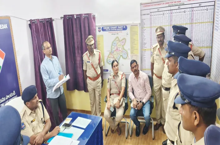 రేగోడు, డిసెంబర్ 22 : మండల కేంద్రమైన రేగోడులోని పోలీస్ స్టేషన్ ను మెదక్ జిల్లా ఎస్పీ శ్రీనివాసరావు సోమవారం ఆకస్మికంగా తనిఖీ చేసి రికార్డులను పరిశీలిం చారు అనంతరం పోలీస్ స్టేషన్ లోని గదులను పోలీసుల పనితీరును పరిశీలించారు. ఈ కార్యక్రమంలో డిసిఆర్బి సీఐ కృష్ణమూర్తి, అల్లాదుర్గం సిఐ రేణుక రెడ్డి, ఎస్ఐ పోచయ్య సిబ్బంది పాల్గొన్నారు.
