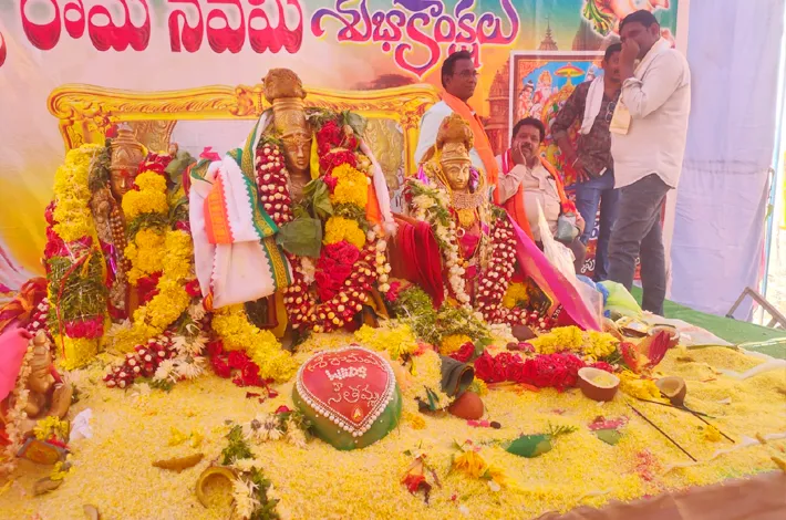కుమ్రంభీం అసిఫాబాద్,(విజయక్రాంతి): శ్రీ సీతారాముల కళ్యాణ మహోత్సవం అత్యంత వైభవంగా జరిగింది. ఆసిఫాబాద్ పట్టణంలోని జనకాపూర్ శ్రీ కోదండ రామాలయం ఆవరణలోని కళ్యాణ మండపంలో వేద పండితులు నిమ్మకంటి సంతోష్ శర్మ ఆధ్వర్యంలో రాజశేఖర్ శర్మ, పూర్ణచందర్, శిరిష్ శర్మ , అభయ్ ఆచార్య, నరేష్ శర్మ, విజయ్ కుమార్, ఆనంద్, ఆచార్య తిరుపతిలు వేదమంత్రోత్సవాల నడుమ సీతారాముల కళ్యాణ మహోత్సవ వేడుక కమనీయంగా నిర్వహించారు. ఆలయ అర్చకుడు వినాయక్ ఆధ్వర్యంలో ఆలయంలో ప్రత్యేక పూజలు నిర్వహించారు. స్వామివారి కల్యాణ వేడుకకు చుట్టుపక్కల గ్రామాల నుండి వేలాదిగా భక్తులు తరలివచ్చారు. ఎమ్మెల్యే కోవా లక్ష్మి దంపతులు పట్టు వస్త్రాలను సమర్పించారు.