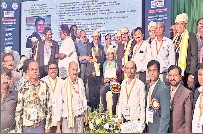 హైదరాబాద్ సిటీ బ్యూరో, నవంబర్ 4 (విజయక్రాంతి): హైదరాబాద్లోని బేగంపేటలో కిమ్స్-సన్షైన్ హాస్పిటల్స్లో కార్డియాక్ సైన్సెస్ విభాగాధిపతిగా, సీనియర్ కన్సల్టెంట్ ఇంటర్వెన్షనల్ కార్డియాలజిస్ట్గా సేవలందిస్తున్న డాక్టర్ శ్రీధర్ కస్తూరికి ‘వైద్య వృత్తి సేవలో శాతవాహన గడ్డ గర్వించదగిన బిడ్డ’ అనే ప్రతిష్టాత్మకమైన బిరుదు, అవార్డు అం దుకున్నారు. సర్టిఫికెట్, ‘వైద్య వృత్తి సేవలో శాతవాహన భూమి గర్వించదగిన పుత్రుడు‘ గోల్డ్ మెడల్, చారిత్రక భూమిలో ఐఎంఏ కరీంనగర్ బ్రాంచ్ నిర్వహించిన 9వ ఇండియన్ మెడికల్ అసోసియేషన్ వార్షిక తెలం గాణ రాష్ట్ర వైద్య సదస్సు 2025 సందర్భంగా ఈ ప్రతిష్టాత్మక అవార్డును ప్రదానం చేశారు.