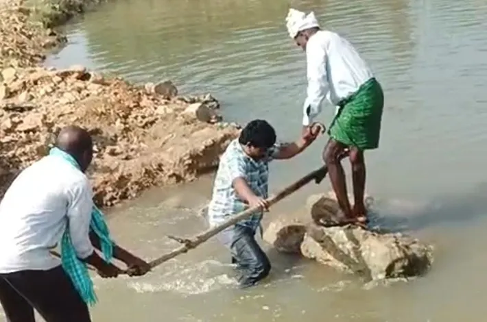 నాగర్ కర్నూల్ (విజయక్రాంతి): నాగర్ కర్నూల్ జిల్లాలో ఓ ప్రభుత్వ టీచర్ పాఠశాలకు చేరేందుకు ప్రమాదకరస్థాయిలో ఉన్న వాగు దాటి సాహసించాడు. తనని నమ్ముకుని పాఠశాలలో విద్యను అభ్యసించే విద్యార్థుల కోసం ఎలాగైనా పాఠశాల చేరేందుకు ప్రమాదకర పరిస్థితుల్లో వాగు దాటారు. ఈ ఘటన నాగర్ కర్నూల్ జిల్లా కోడేరు మండలం రాజాపూర్ గ్రామంలో వెలుగు చూసింది. రాజాపూర్ జడ్పీహెచ్ఎస్ ఉన్నత పాఠశాలలో పనిచేస్తున్న తెలుగు పండిట్ దేవరపాగ ప్రభాకర్ నాగర్ కర్నూల్ జిల్లా కేంద్రంలో నివాసం ఉంటున్నారు.