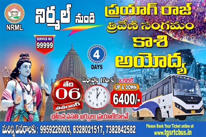 అక్కడ పవిత్ర స్నానం ఆచరించి మధ్యాహ్ననం 2 గం!! లకు కాశీ చేరుకుంటుంది. అక్కడ కాశి విశ్వనాధ్, విశాలాక్షి, అన్న పూర్ణ మాత, గంగాహారతి తీసుకొని ఆ రోజు రాత్రి కాశీ లోనే నైట్ హల్ట్ తెల్లవారి అయోధ్యకు చేరుకొని బాల రాముని దర్శించుకొని 9వ తేదీ రాత్రి నిర్మల్ చేరుకొనును ఒకరికి 6400/- రూ!! లు ఉంటుందని మన నిర్మల్ బస్టాండ్ లో గాని tgsrtcbus.in సైట్ లో లాగిన్ అయి మీ ఫోన్ లో కూడా బుక్ చేసుకోండి అని డిపోమేనేజర్ తెలిపారు.