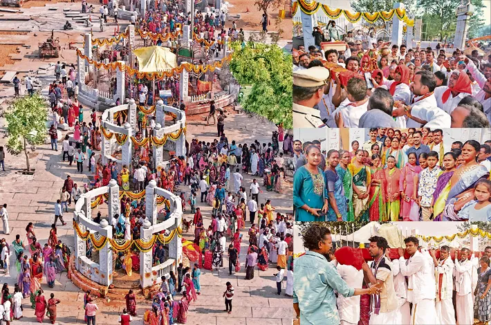 * మేడారం జాతరలో భక్తుల దర్శనానికి ఒకే వరుసలో.. ఆదివాసీ సాంప్రదాయాల ప్రకారం నూతనంగా ఏర్పాటుచేసిన రాతి గద్దెల మీద బుధవారం పగిడిద్దరాజు, గోవిందరాజుల ప్రతిష్ఠాపన కార్యక్రమం ఘనంగా జరిగింది. ఆదివాసీ డోలు చప్పుళ్లతో, సంప్రదాయ నృత్యాలతో అంగరంగ వైభవంగా జరిగిన ఈ కార్యక్రమంలో ఆదివాసీ పూజారులంతా హాజరయ్యారు.
