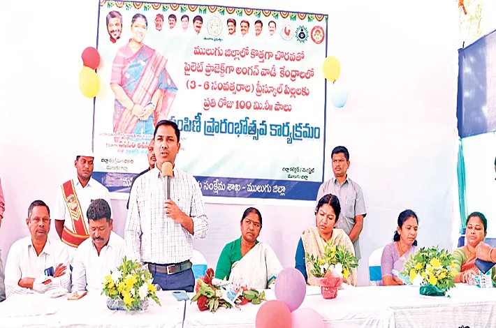సోమవారం ములుగు జిల్లా కేం ద్రంలోని కృష్ణా కాలనీ అంగన్వాడీ కేంద్రం లో తెలంగాణ రాష్ట్రంలోనే తొలిసారిగా చేపట్టిన పైలట్ ప్రాజెక్టులో భాగంగా ప్రీస్కూల్ చిన్నారులకు ప్రతీరోజు 100 మి.లీ పాల పంపిణీ కార్యక్రమాన్ని జిల్లా కలెక్టర్ దివాకర టి.ఎస్ ఐటీడీఏ పీవో చిత్రమిశ్ర, అదనపు కలెక్టర్ మహేందర్ జిలతో కలిసి ప్రారంభించారు.
