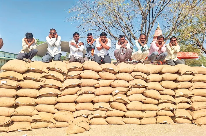 - ఆదిలాబాద్ జిల్లా బేల మార్కెట్ యార్డ్లో బస్తాల మీద మోకాళ్లపై కూర్చుని రైతుల నిరసన