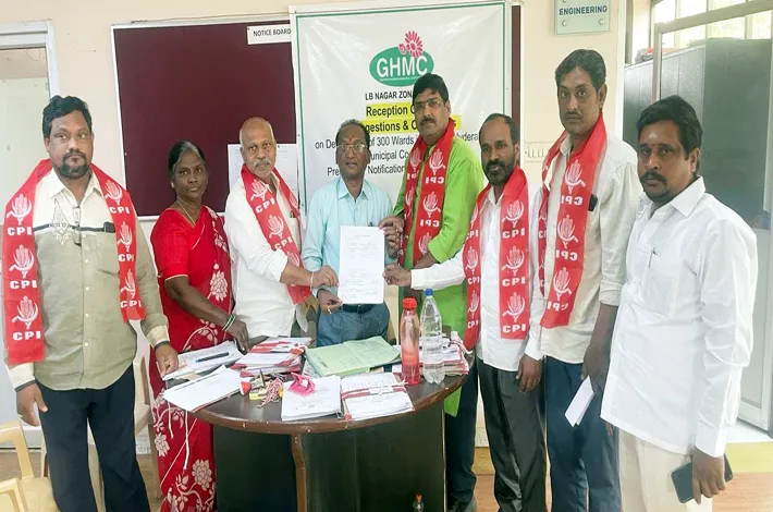 ఎల్బీనగర్, డిసెంబర్ 14 : కొత్తగా ఏర్పాటు చేస్తున్న డాక్టర్స్ కాలనీ డివిజన్ పేరు మార్చాలని, అత్యధిక సంఖ్యలో పేదలు నివసిస్తున్న భగత్ సింగ్ నగర్, శంకర్ నగర్ కాలనీలను కలిపి భగత్ సింగ్ నగర్ డివిజన్ గా మార్చాలని సీపీఐ నాయకులు డిమాండ్ చేశారు. సీపీఐ సరూర్ నగర్ మండల కార్యదర్శి రంగారెడ్డి, జిల్లా కార్యవర్గ సభ్యుడు బాతరాజు నర్సింహ ఆధ్వర్యంలో ఎల్బీనగర్ జోనల్ కార్యాలయంలో సూపరింటెండెంట్ రామాంజనేయులుకు వినతిపత్రం అందజేశారు.