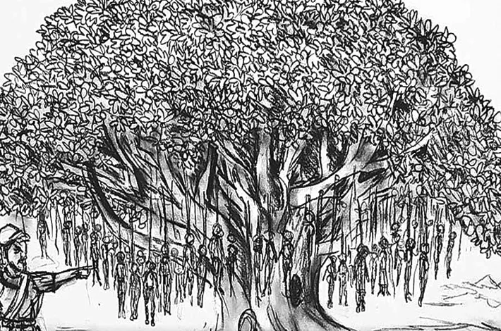 బ్రిటీషు, నైజాం వారి ఆధునిక ఆయుధా ల ముందు ఆదివాసుల ఆయుధాలు నిలవలేకపోయాయి. రాంజీ గోండ్ నాయక త్వం లో బ్రిటీష్ సైన్యంతో హోరాహోరి సాగిన యుద్ధంలో చాలామంది అదివాసీలు వీరమరణం పొందారు. రాంజీ గోండ్ సహా 1000 మందిని నిర్మల్ నడిబొడ్డున ఉన్న ‘ఊడల మర్రిచెట్టు’కు 1860 ఏప్రిల్ 9న ఉరి తీశారు. దీంతో ఆ మర్రిచెట్టు వెయ్యి ఊడల మర్రి చెట్టుగా ప్రసిద్ధి చెందింది.