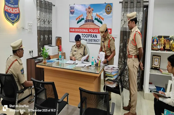 తూప్రాన్, డిసెంబర్ 30 : మెదక్ జిల్లా ఎస్పీ శ్రీనివాసరావు తూప్రాన్ డీఎస్పీ కార్యాలయంలో ఆకస్మిక తనిఖీ నిర్వహించారు. ఈ సందర్భంగా కార్యాలయంలో నిర్వహణ విధానాలు, కేసుల నమోదు, దర్యాప్తు పురోగతి తదితర అంశాలకు సంబంధించిన అన్ని రిజిస్టర్లను సవివరంగా పరిశీలించారు. నేరాల నియంత్రణలో మరింత చురుకైన చర్యలు తీసుకోవాలని, ము ఖ్యంగా పునరావృత నేరాలపై కఠినంగా వ్యవహరించాలని తూప్రాన్ డీఎస్పీకి ఆదేశాలు జారీ చేశారు.