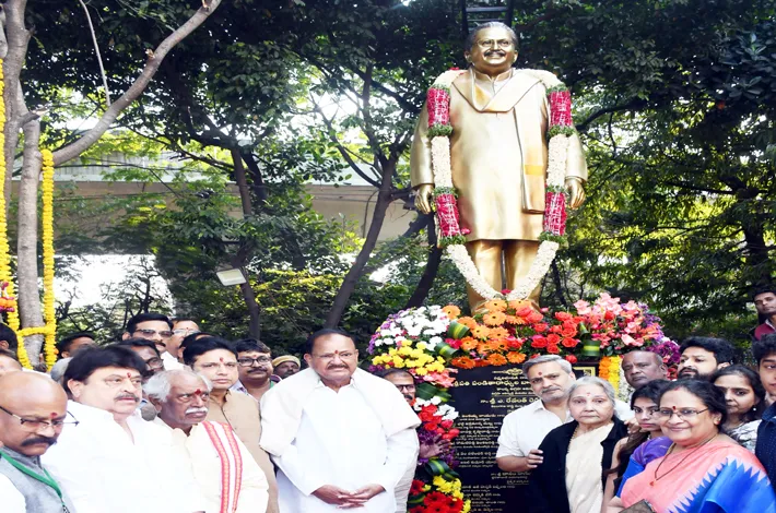 హైదరాబాద్ సిటీ బ్యూరో, డిసెంబర్ 15 (విజయక్రాంతి): రవీంద్రభారతి ప్రాంగణంలో ఎస్పీ బాలసుబ్రహ్మణ్యం 7.2 అడు గుల కాంస్య విగ్రహాన్ని సోమవారం మాజీ ఉపరాష్ర్టపతి వెంకయ్య నాయుడు, మంత్రి శ్రీధర్బాబు ఆవిష్కరించారు. కొద్దిరోజులుగా సాగుతున్న వివాదాలు, తెలంగాణ ఉద్యమకారుల నిరసన హెచ్చరికల నడుమ విగ్రహావిష్కరణ జరిగింది. ఈ విగ్రహాన్ని తూర్పుగోదావరి జిల్లా కొత్తపేటలో ప్రముఖ శిల్పి రాజ్ కుమార్ ఉడయార్ చేత తయారు చేయించారు.